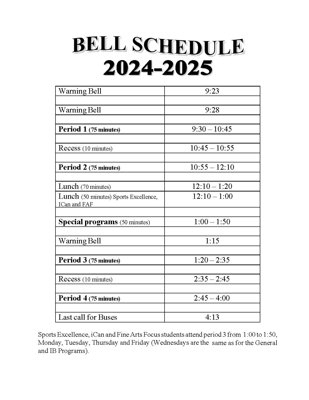 Les élèves inscrits à un programme de concentration (Sports Excellence, Fine Arts Focus ou iCan) ont leur troisième période de 13 h à 13 h 50 les lundis, mardis, jeudis et vendredis. Le mercredi, ils suivent le même horaire que les élèves du programme régulier et du BI.